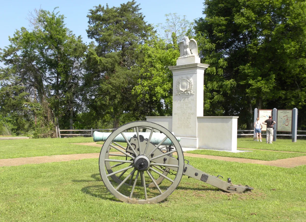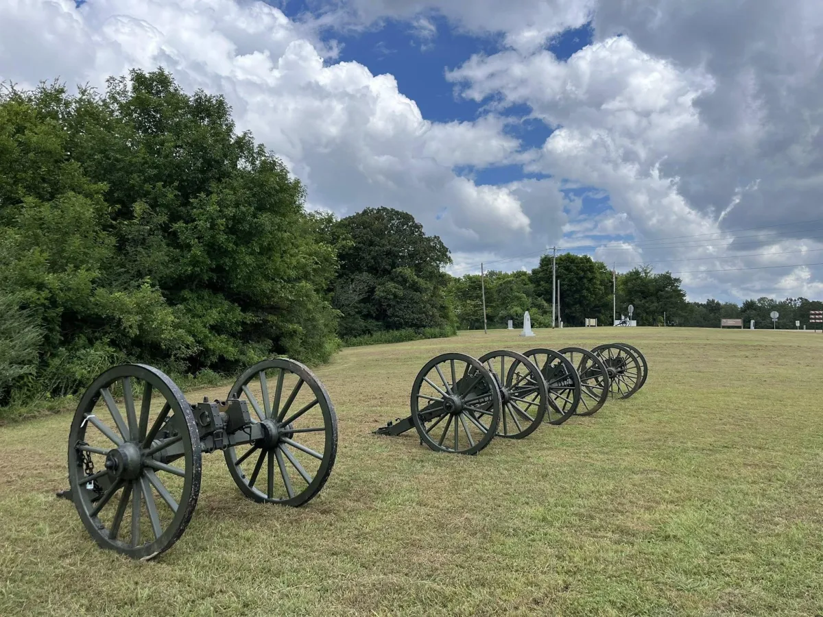 The Tupelo National Battlefield is open daily and maintained by the National Park Service. The site includes a cannon, a marker with text, and maps outlining the engagement.